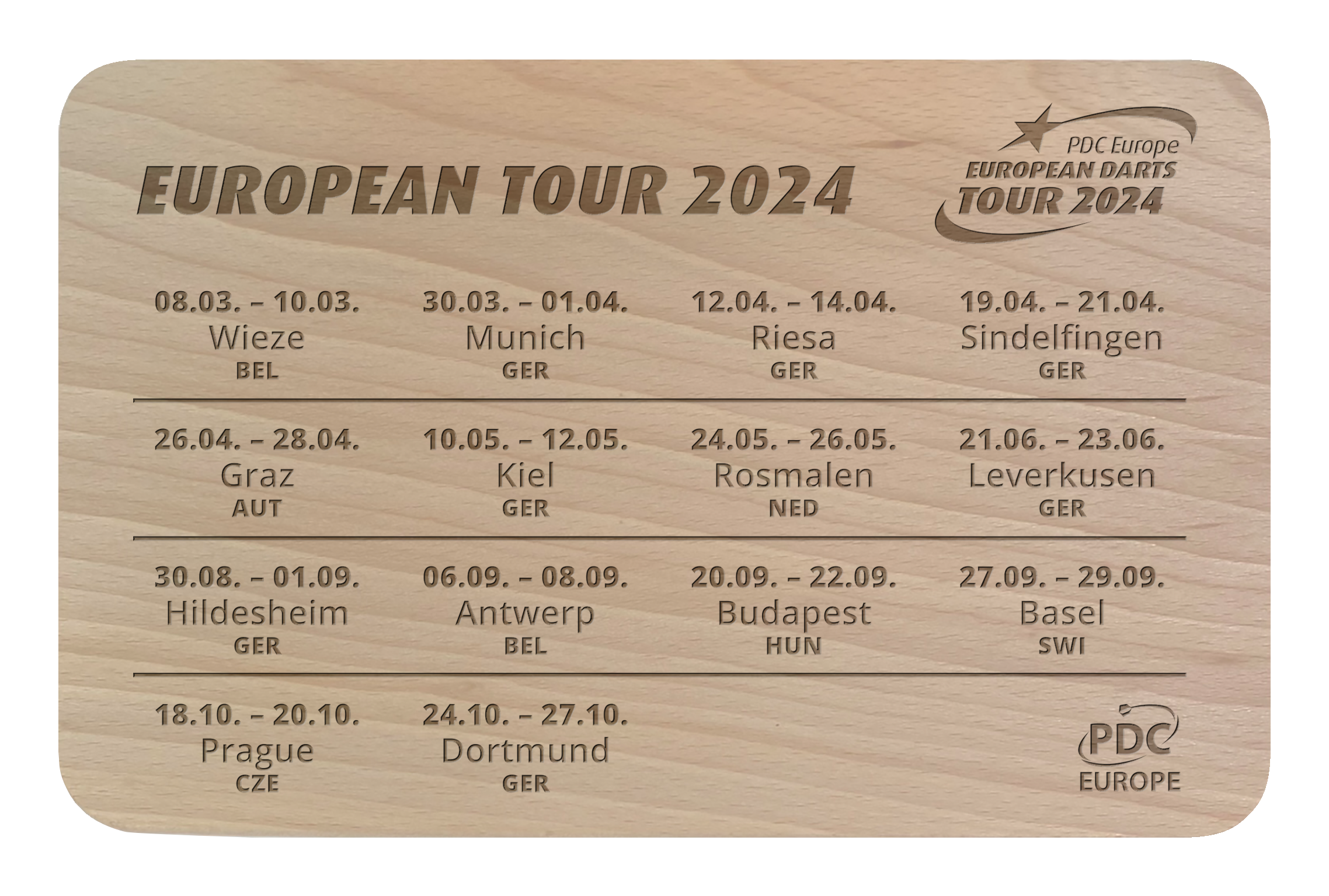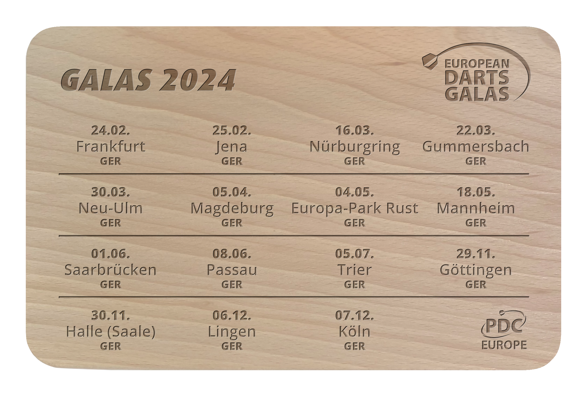 Dann ist das hochwertige Holz-Schneidebrett das optimale Andenken für dich! Vorne die Daten der European Tour 2024 und hinten alle Galas der PDC Europe gelistet – der Anblick des Holzbretts lässt sogar Gemüseschneiden Spaß machen!