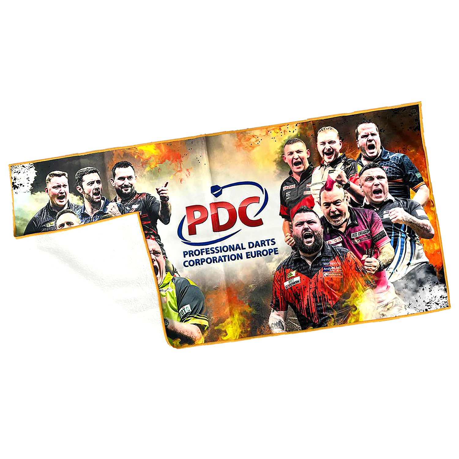 At the heart of the towel is the impressive PDC Europe logo, a symbol of exciting competitions. Surrounding the logo are portraits of the celebrated stars of PDC Europe, embodying the passion and intensity of darts.