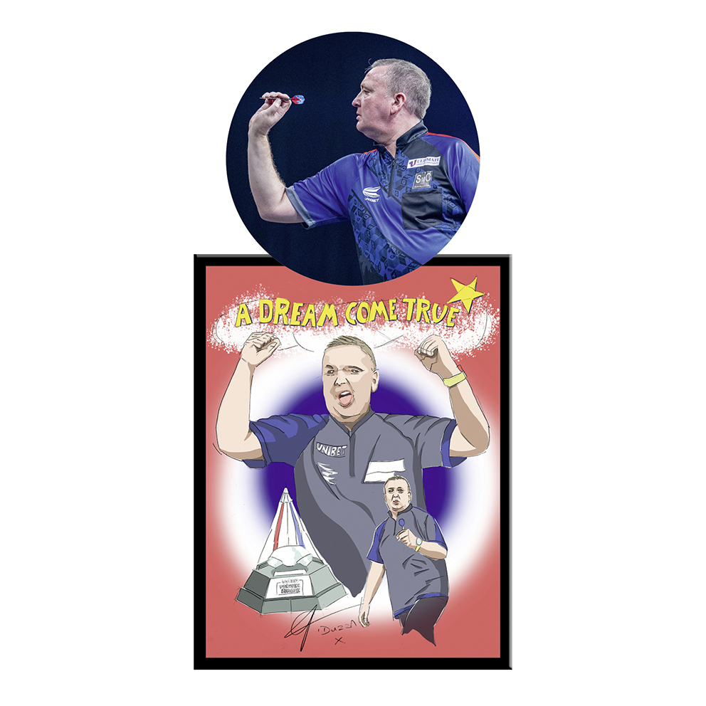 Glen Durrant persönlich gezeichnet wurde. Dieses einzigartige Stück, signiert, ist nicht nur eine Hommage an die Präzision des Dartsports, sondern auch ein beeindruckendes Kunstwerk, das jeden Raum schmücken wird.